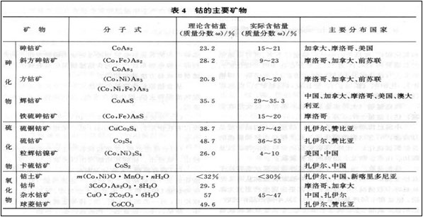 - 已知的含钴矿物约100种。主要的钴矿物为:硫钴矿(Co₃S₄)、纤维柱石(CuCo₂S₄)、辉砷钴矿(CoAsS)、砷钴矿(CoAs₂)、钴华(3CoO·As₂O₅·8H₂O)等。世界上的主要钴矿有四种类型:①铜钴矿②镍钴矿,包括硫化矿和氧化矿;③砷钴矿;④含钴黄铁矿。这些钴矿含钴均较低。